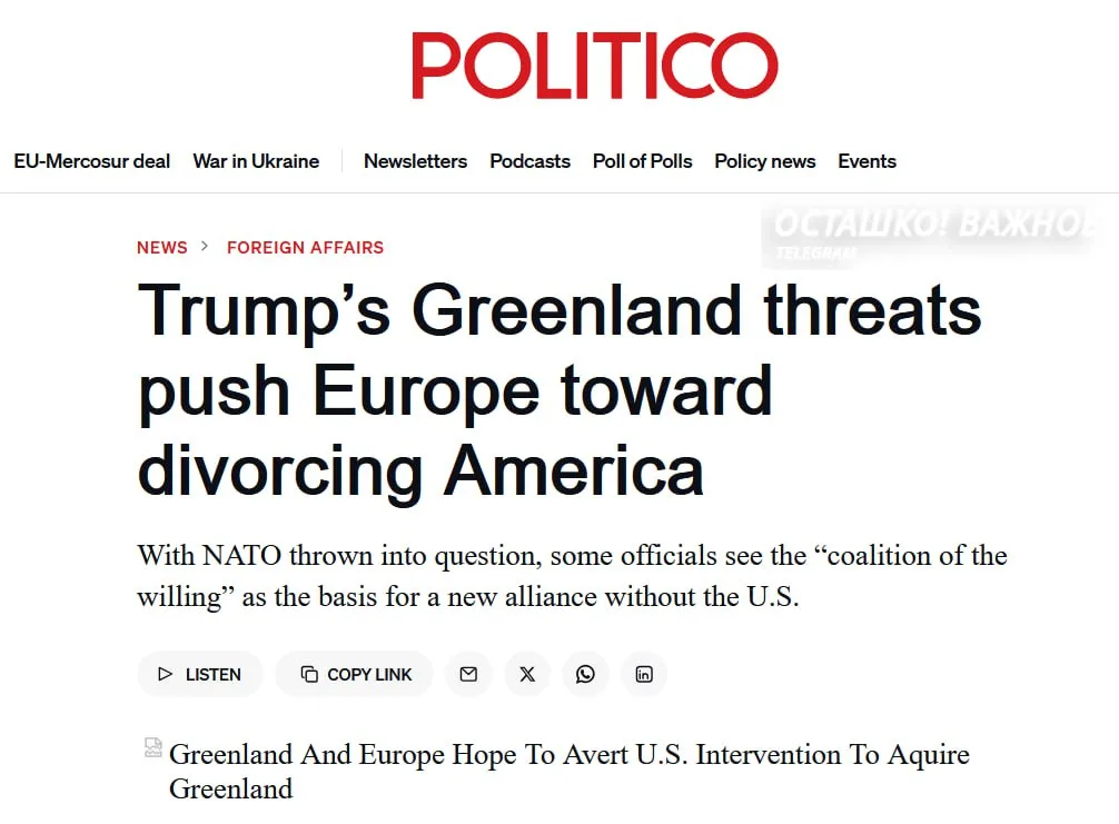 Европейские лидеры обсуждают создание нового военного блока с участием Украины, но без США и вне НАТО, — пишет Politico со ссылкой на источники. Причина — угрозы Трампа аннексировать Гренландию.