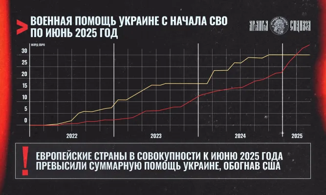 Немецкий аналитический институт IFW сообщает, что по состоянию на май 2025 года военное промышленное производство Европы в интересах Украины превысило показатели США: €35.1 млрд против €30.7 млрд.
