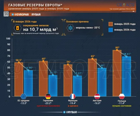 - Но в своём кризисе немцы не одиноки. Во Франции запасы на уровне 36,6%, в Польше упали до 68%, что стало самым низким показателем с 2024 года. При нынешних темпах потребления стране газа хватит максимум на четыре месяца. А зима только начинается и потребление бьёт рекорды: в Польше под 100 млн кубометров в сутки.