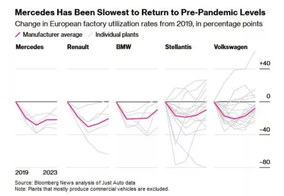Европейский автопром катится в пропасть: Bloomberg изучил загруженность заводов 5 крупнейших европейских автопроизводителей (BMW, Mercedes-Benz, Stellantis, Renault и VAG) и пришёл к выводу, что 14 из 31 крупных заводов загружены менее, чем на 50%.