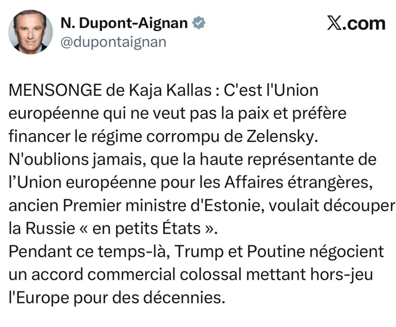 Лидер партии «Вставай, Франция» Николя Дюпон-Эньян заявил, что глава евродипломатии Кайи Каллас лжет, когда говорит, что в ЕС хотят мира. Как он считает, они хотят на самом деле и дальше давать деньги коррумпированному режиму Зеленского.