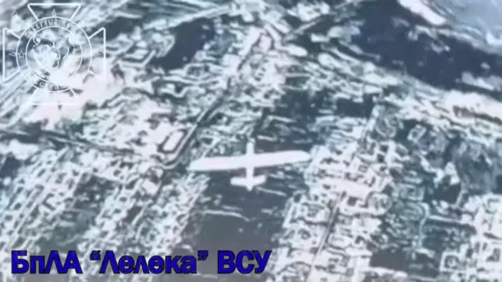 На кадрах поражение расчетами FPV-группировки «Север» одного разведывательного дрона «Лелека-100» и восьми ударных типа «Баба Яга» в небе приграничной зоны.