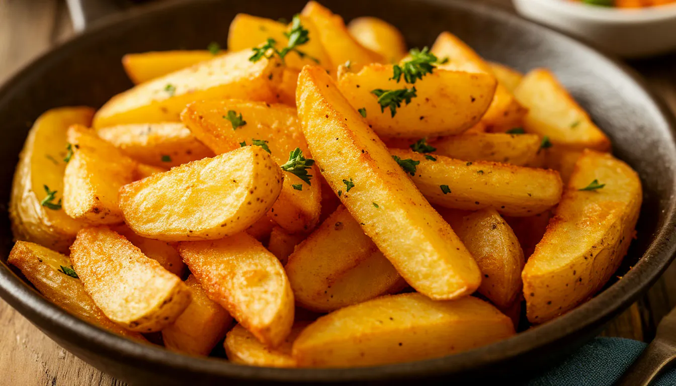 Секрет в химической реакции. При варке картошки в воде с добавлением щепотки соды, щелочная среда воздействует на поверхность клубней. Она частично разрушает пектин — природный «клей» в клетках — и выводит крахмал наружу. Этот крахмал, высохнув, формирует тонкую оболочку. При обжаривании или запекании она превращается в ту самую золотистую, хрустящую, и практически непробиваемую корочку, которая не позволяет маслу проникнуть внутрь. Картошка остаётся лёгкой, а не жирной.