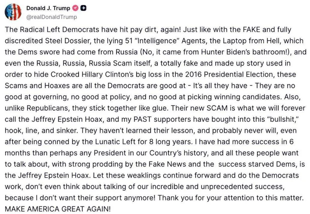«Их новый обман — то, что мы навсегда будем называть “мистификацией Джеффри Эпштейна”. И мои бывшие сторонники клюнули на это дерьмо целиком — с крючком, леской и грузилом. Они так и не научились, и, похоже, никогда не научатся, даже после восьми лет, когда их водили за нос безумцы с леволиберальной повесткой».