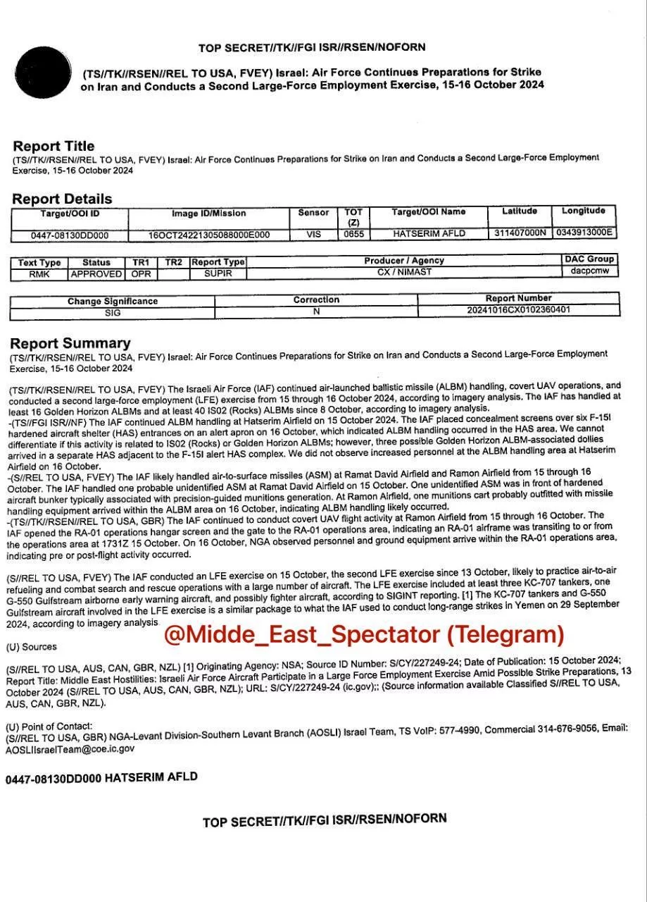 На двух образцах внутренней документации АНБ и Национального агентства геопространственной разведки анализируются проводимые с 8 октября на авиабазе Хацерим учебные пуски аэробаллистических ракет «Golden Horizon» (не менее 16 пусков) «Rocks» (не менее 40) и проведённые на авиабазах Рамон и Рамот Давид 15-16 октября пуски ракет класса «воздух-земля» (модели не уточняются). Также 15 октября проводились учения по дозаправке в воздухе, в которых были задействованы самолёты-топливозаправщики KC-707 и G-550 Gulfstream. Вероятно, информация составлена путём анализа спутниковых снимков.