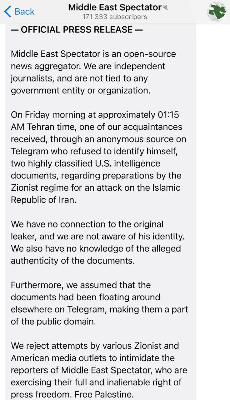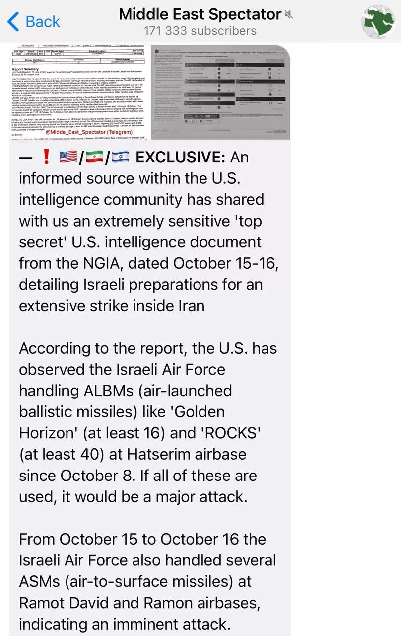 Документы были опубликованы в проиранским телеграм-канале Middle East Spectator (к слову, давно читаем), посвящённом Ближнему Востоку, ночью 18 октября с пометкой «эксклюзив» от «осведомлённого источника в разведсообществе США».