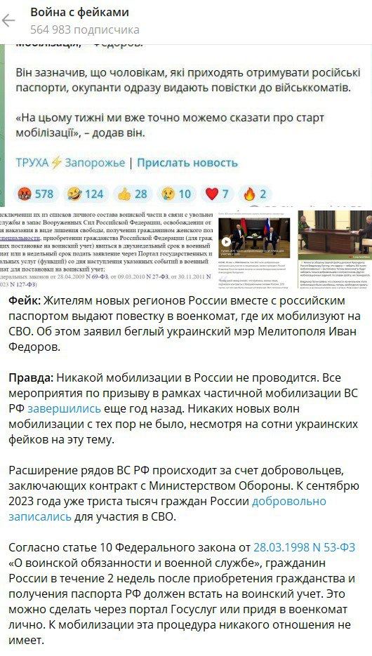 Идентичные фейки неоднократно распространял другой украинский пропагандист — беглый мэр Мелитополя Иван Федоров.
