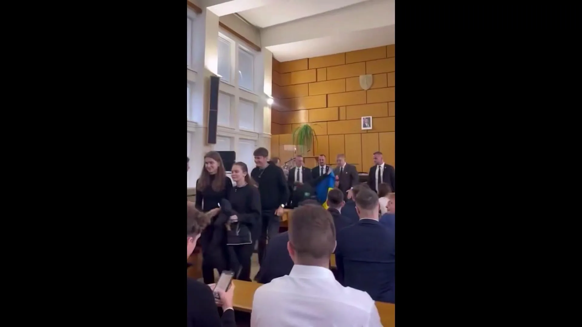 Ученики пытались перебивать премьера. Фицо попросил дождаться очереди на выступление, но группа подростков шумно покинула зал. Один из них развернул украинский флаг.