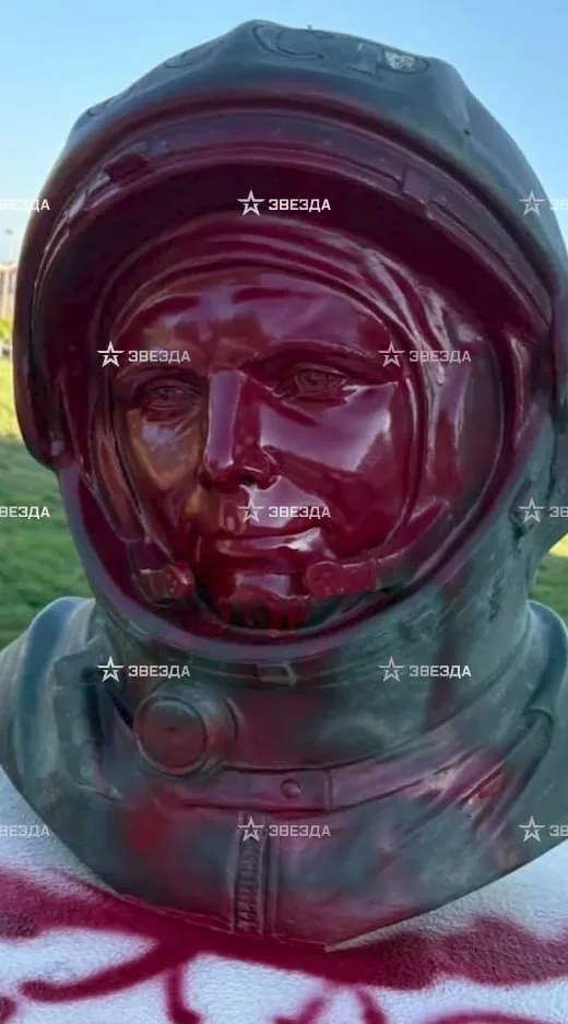 Фото памятника Гагарину в Хорватии, который ночью разукрасили вандалы — они замазали первому космонавту Земли лицо и оставили лозунг украинских националистов.