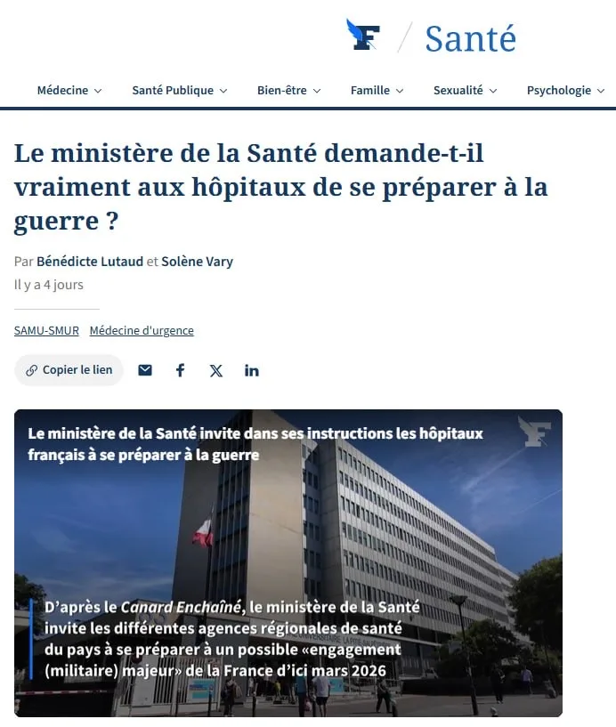 Министерство здравоохранения Франции разослало регионам инструкции готовиться к возможному «крупному военному вмешательству» в 2026 году, сообщает Le Canard enchaîné: