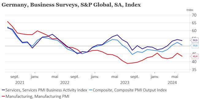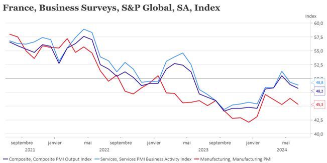 Промышленность в еврозоне — уходящая натура. Индекс PMI по этому направлению показывает сокращение активности как во Франции и Германии, так и по еврозоне в целом. Более того, во Франции уходит в минус и сектор услуг.