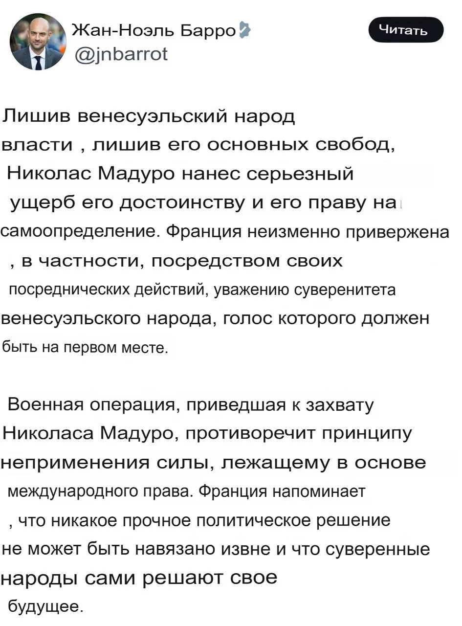 Глава МИД Франции Жан-Ноэль Барро прокомментировал события в Венесуэле, заявив, что операция по задержанию Николаса Мадуро была проведена незаконно, но винить в произошедшем нужно самого лидера страны.