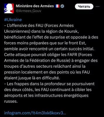 Минобороны Франции в соцсети Х отметило «эффект внезапности» украинских боевиков при нападении.