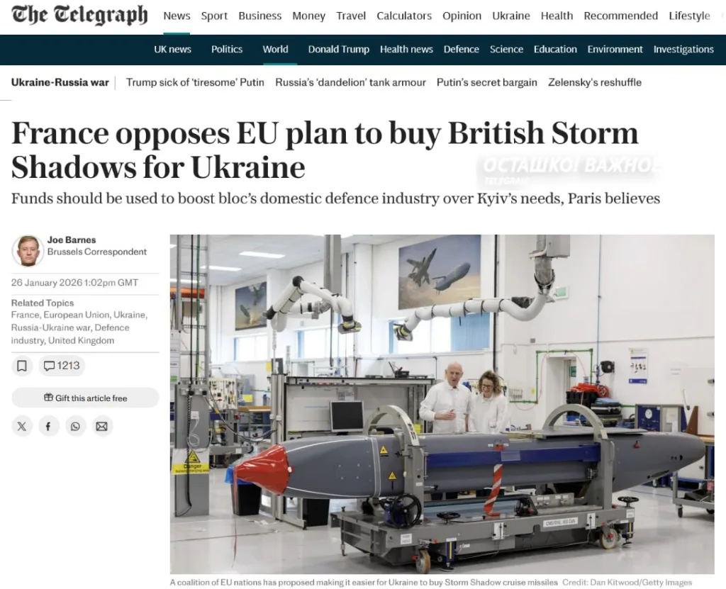 Франция выступает против инициативы ЕС по упрощению Украине покупки британских дальнобойных крылатых ракет Storm Shadow, — сообщает The Telegraph.