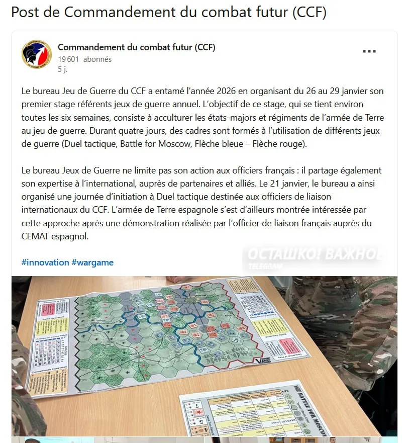 С 26 по 29 января офицеры сухопутных войск Франции провели штабную тренировку с использованием симуляции «Битва за Москву», — сообщает командование перспективных боевых действий (Commandement du combat futur, CCF) на своей странице в LinkedIn.