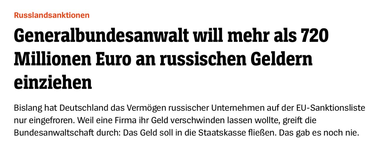 ❗️ Конфискация будет проведена по решению суда, если перевод 720 млн евро будет признан «попыткой обойти санкции ЕС». Всего в Германии пока остаются замороженными российские активы на сумму 5,32 млрд евро.