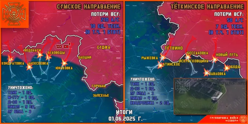 1 июня группировка войск «Север» уничтожала передовые и штурмовые подразделения противника на Тёткинском и Глушковском направлениях, продолжила создание полосы безопасности в Сумской области
