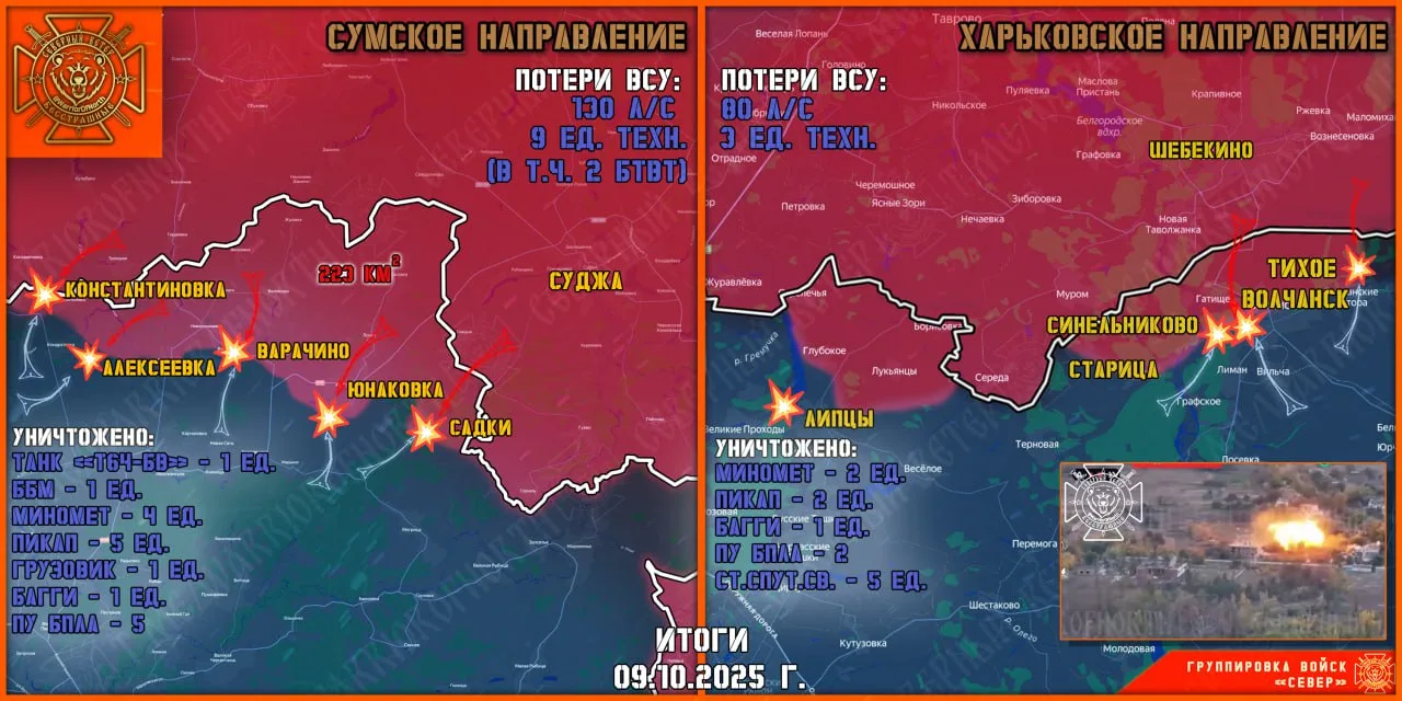 За сутки потери противника составили свыше 210 человек (из них более 130 в Сумской области и свыше 80 в Харьковской). Также вскрыто и уничтожено: