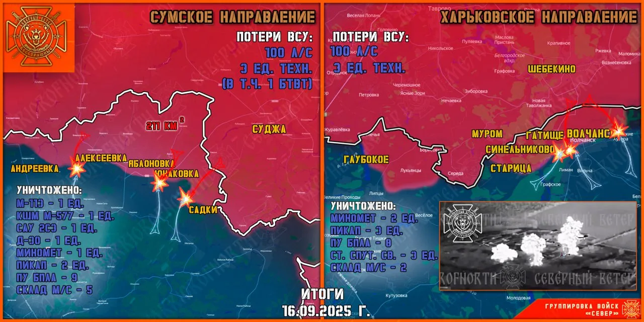 На всем участке фронта продолжаются встречные бои . Противник активизировался в районе Садков и усиливает давление на фланги наступающей группировки Северян. Авиация ВКС РФ, расчеты БпЛА и артиллерия ГВ «Север» продолжают наносить удары по выявленным целям и логистическим узлам ВСУ.
