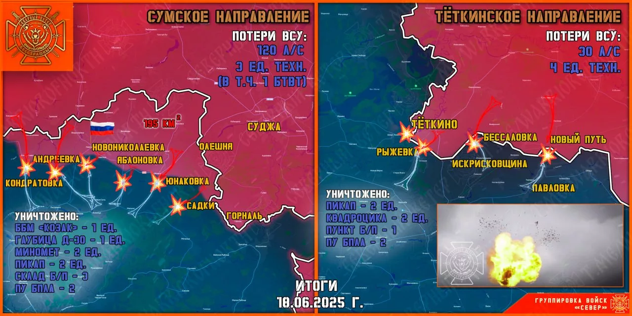 18 июня группировка войск «Север» уничтожала передовые и штурмовые подразделения противника на Тёткинском и Глушковском направлениях, продолжила создание полосы безопасности в Сумской области