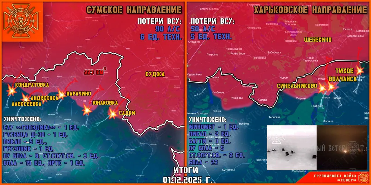 Штурмовые подразделения группировки Север продолжают с тяжелыми боями продвигаться вглубь Сумской области при поддержке авиации, артиллерии и «Солнцепеков». Противник активных действий не предпринимал и отсиживается в обороне.