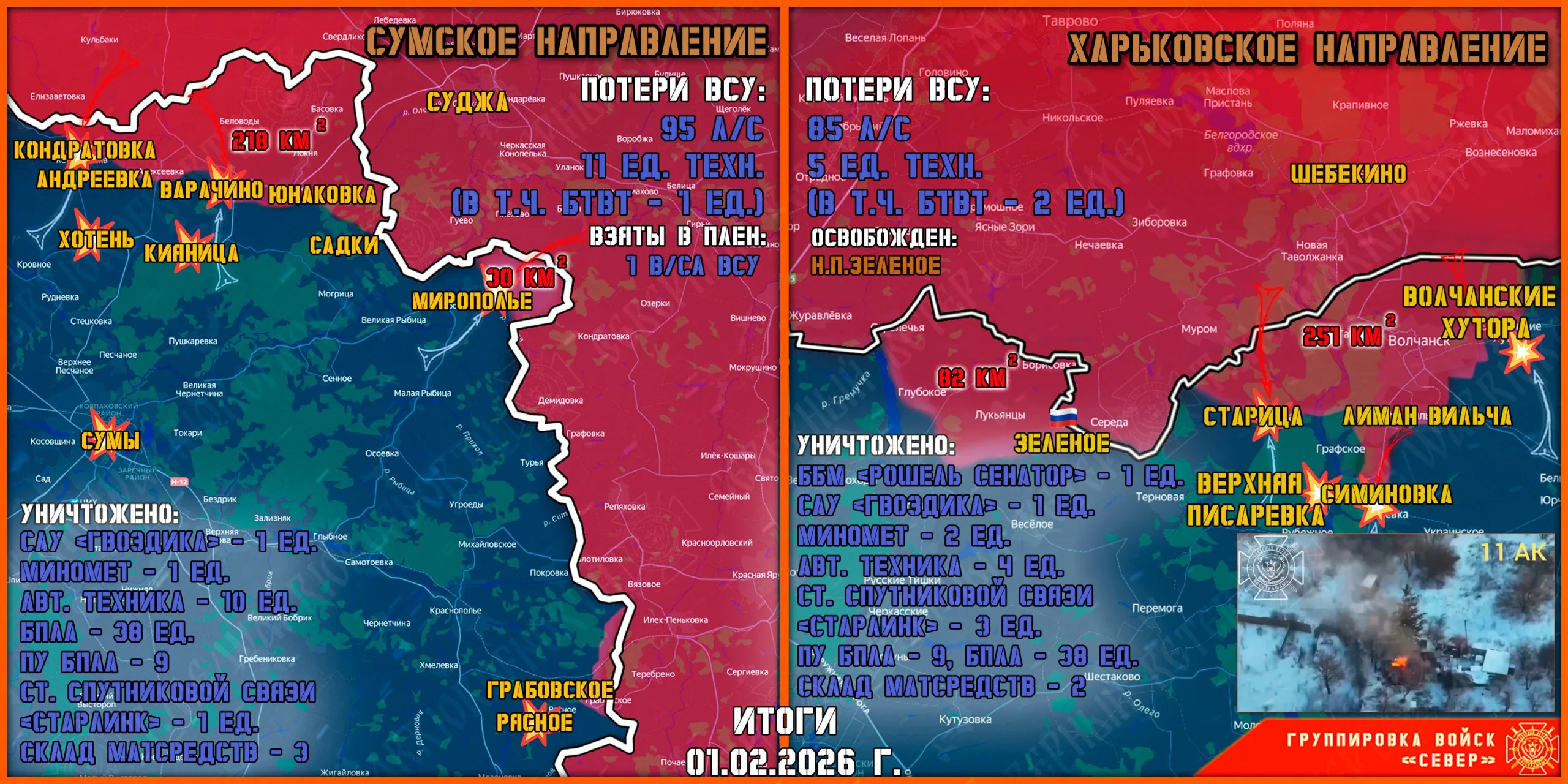 Северяне сохраняют высокие темпы продвижения в Сумской области при активной поддержке артиллерии и «Солнцепеков». Российская авиация и расчеты БпЛА «Герань» продолжали точечно работать по тыловым районам и логистическим узлам ВСУ. Противник активных действий не предпринимал и выводит в тыл потерявшие боеспособность, подразделения.