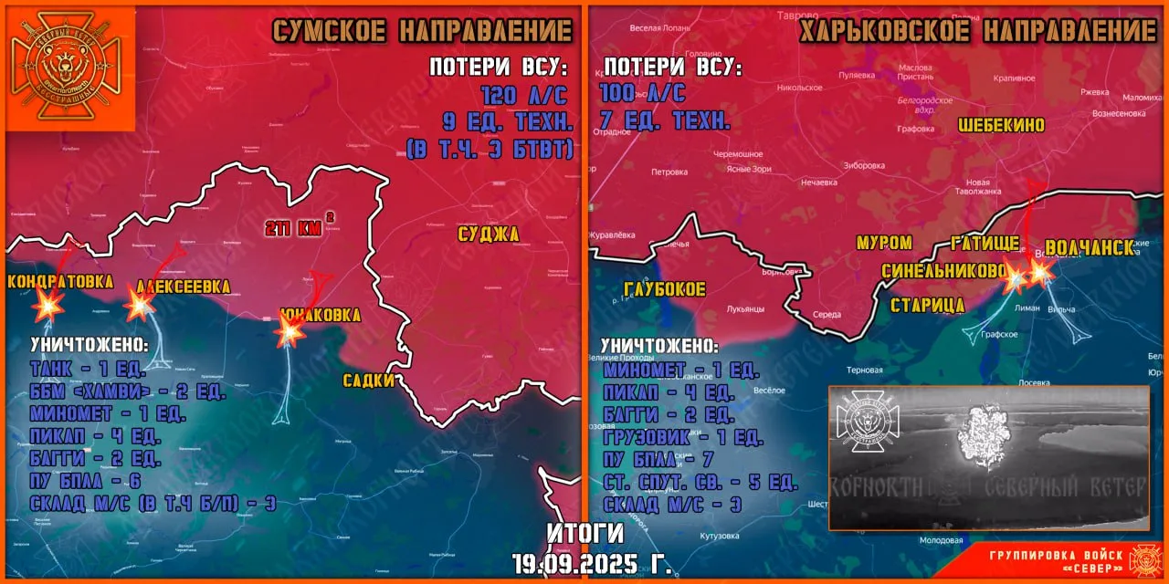 За сутки потери противника составили свыше 220 человек (из них более 120 в Сумской области и свыше 100 в Харьковской), двое взято в плен. Также вскрыто и уничтожено:
