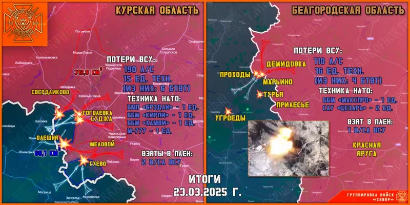 23 марта группировка войск «Север» уничтожала личный состав и технику противника, пытавшегося прорваться в Белгородскую область, и продолжила освобождение Суджанского приграничья