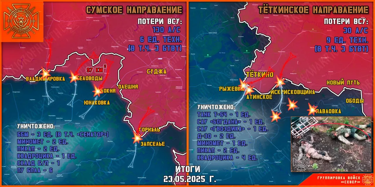 23 мая группировка войск «Север» уничтожала передовые и штурмовые подразделения противника на Тёткинском и Глушковском направлениях, продолжила создание полосы безопасности в Сумской области
