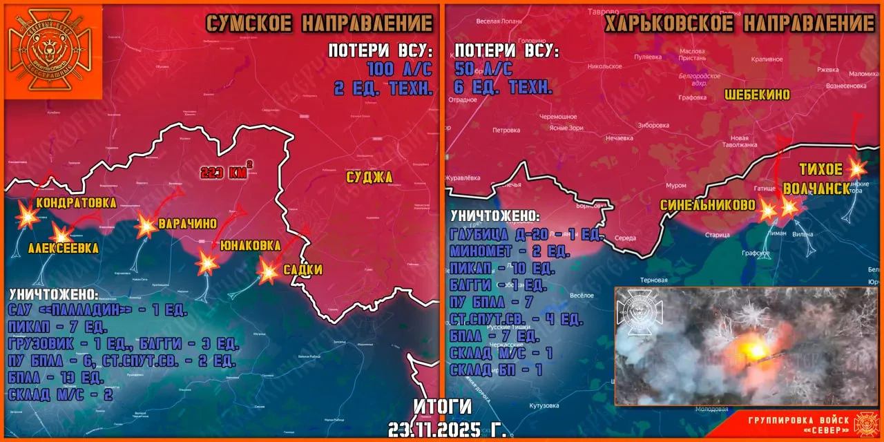 На всем участке фронта в Сумской области продолжаются ожесточенные бои. Российская авиация и «Герани» бьют по позициям противника, уничтожая живую силу и технику. Северяне продолжают продвижение по лесополосам, отражая контратаки ВСУ.