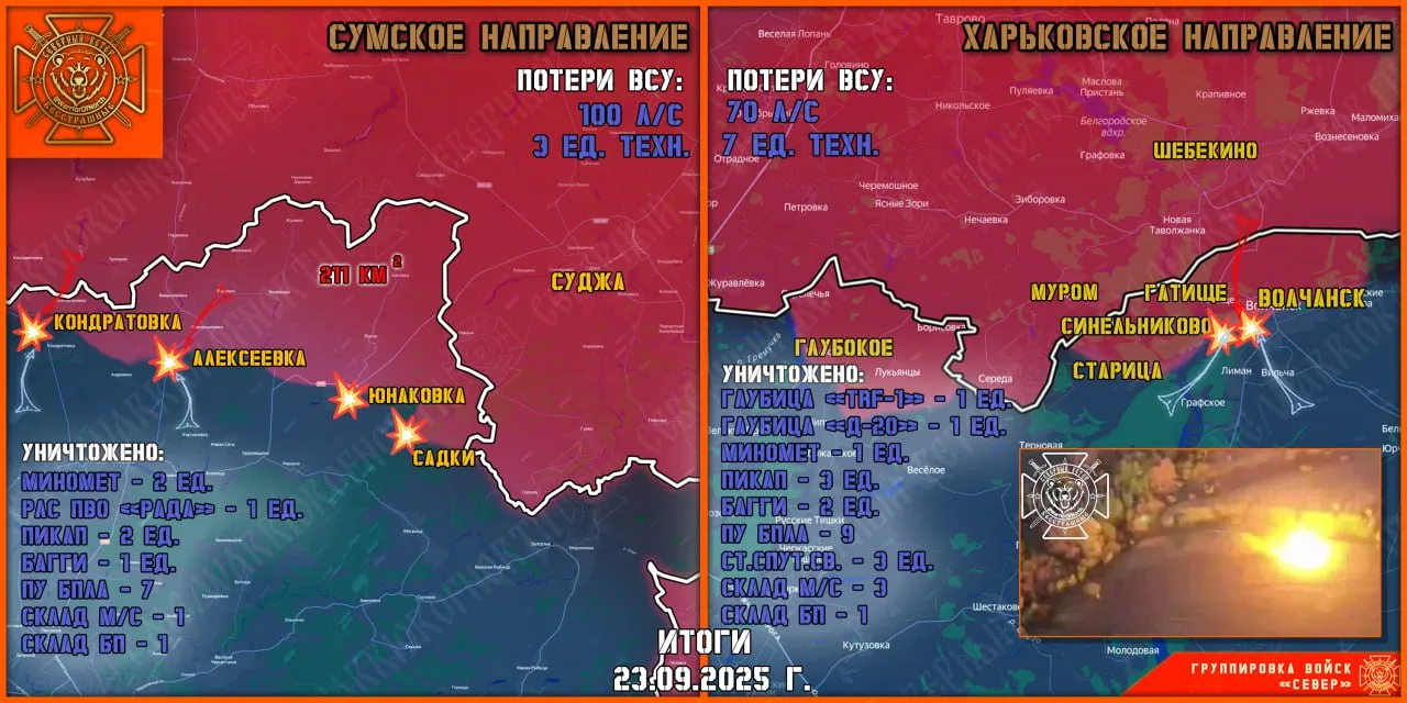 За сутки потери противника составили свыше 170 человек (из них более 100 в Сумской области и свыше 70 в Харьковской), 1 взят в плен. Также вскрыто и уничтожено: