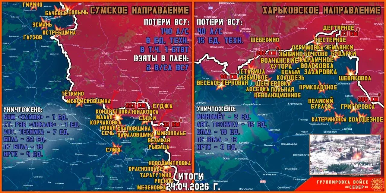 Штурмовики ГВ «Север» продолжают вести ожесточенные бои, продвигаясь вглубь Сумской области. Наши войска нанесли удары по скоплениям живой силы и техники противника в районах Эсмани, Гирино, Искрисковщины, Вакаловщины, Храповщины, Великой Рыбицы, Мирополья, Бачевска, Малой Слободки, Новодмитровки, а также сёл Коренёк и Новая Сечь.