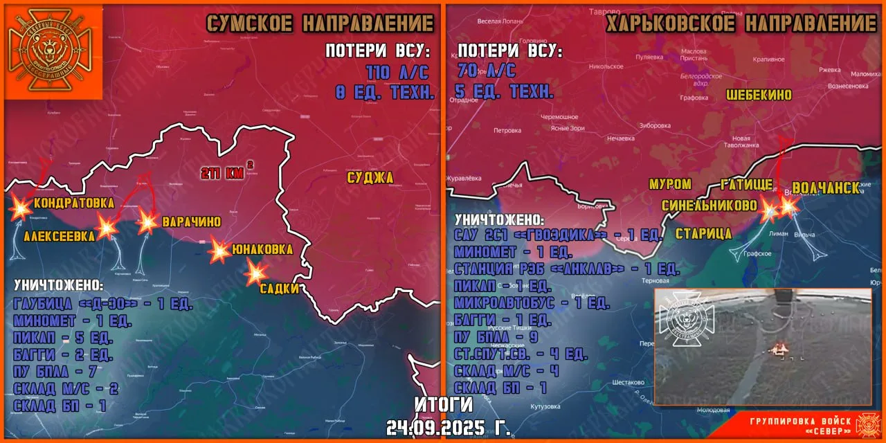 За сутки потери противника составили свыше 180 человек (из них более 110 в Сумской области и свыше 70 в Харьковской), 2 взято в плен. Также вскрыто и уничтожено: