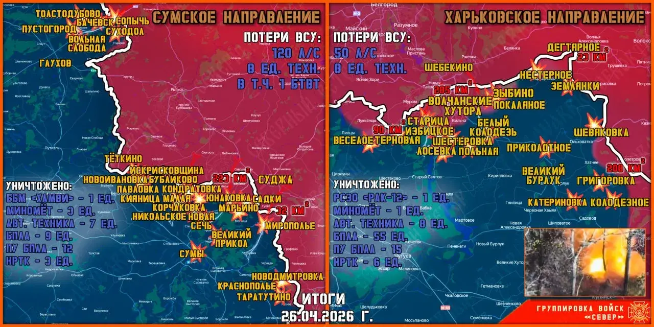 Северяне продолжают вести ожесточенные бои, отодвигая врага от государственной границы. Наши войска нанесли удары по скоплениям живой силы и техники противника в районах Весёлого, Варваровки, Украинского, Польной, Приколотного, Березовского, Золочева и Казачьей Лопани.