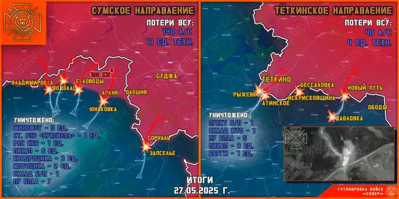 27 мая группировка войск «Север» уничтожала передовые и штурмовые подразделения противника на Тёткинском и Глушковском направлениях, продолжила создание полосы безопасности в Сумской области