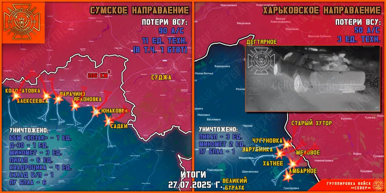 - Противник предпринял две безуспешные контратаки: силами 143 омбр юго-восточнее села Чугуновка и 22 омбр около села Зарубинка. Обе штурмовые группы уничтожены в ходе стрелковых боев и огневого воздействия наших операторов БпЛА и артиллеристов.