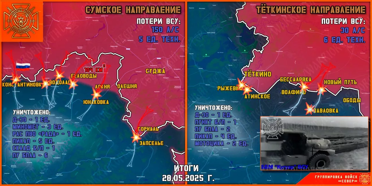 28 мая группировка войск «Север» уничтожала передовые и штурмовые подразделения противника на Тёткинском и Глушковском направлениях, продолжила создание полосы безопасности в Сумской области