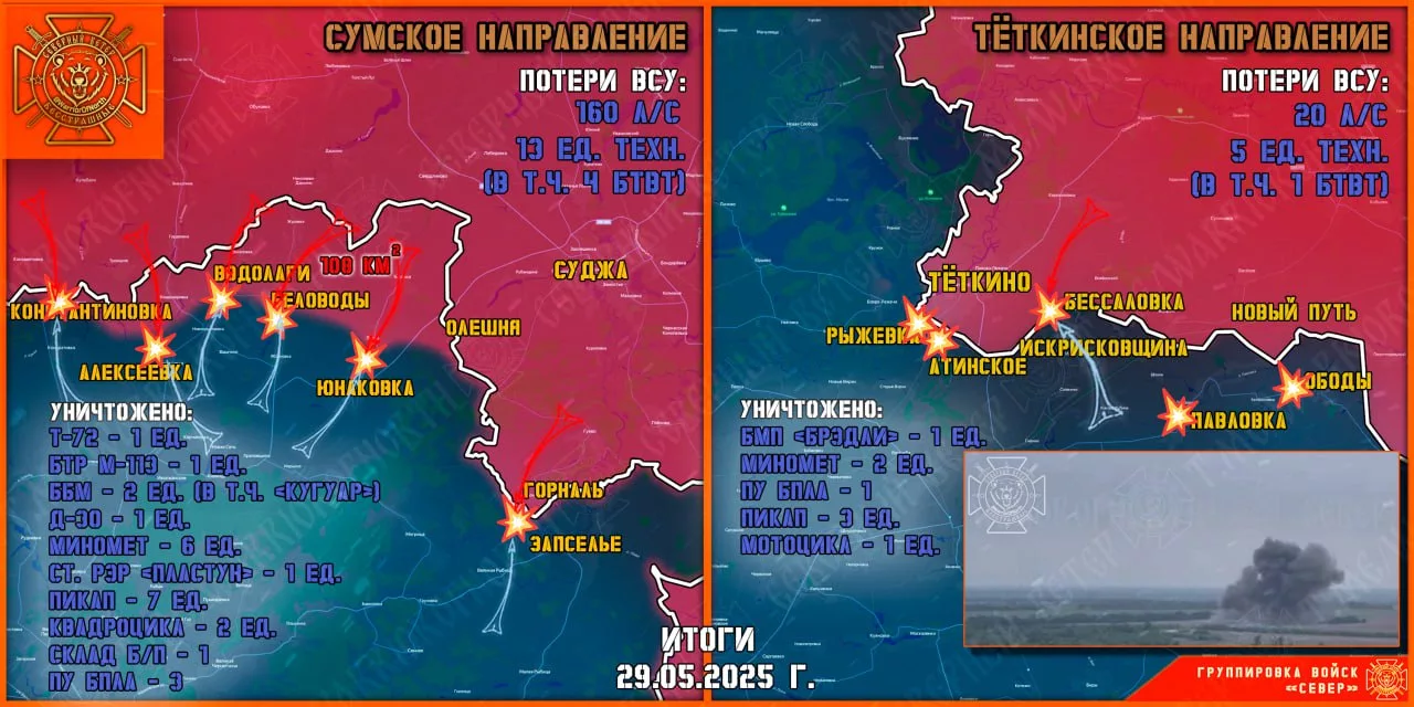 29 мая группировка войск «Север» уничтожала передовые и штурмовые подразделения противника на Тёткинском и Глушковском направлениях, продолжила создание полосы безопасности в Сумской области