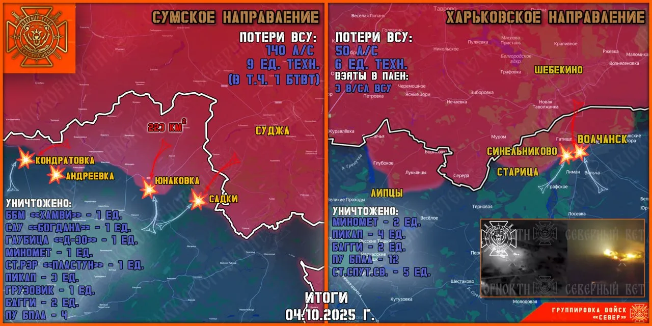 Северяне продолжают продвижение на правом фланге наступления. Противник восстанавливал боевой потенциал после неудачных попыток прорвать оборону группировки «Север». По скоплениям живой силы и техники ВСУ в районах Кондратовки, Андреевки, Юнаковки и Садков работала российская авиация и артиллерия.