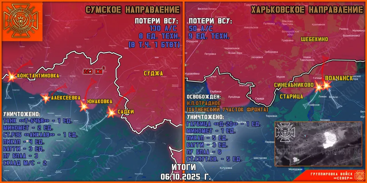В ходе продвижения уничтожено до взвода живой силы противника 3 отмбр ВСУ и ББМ. Ударами авиации уничтожены пункты дислокации 3 отмбр и 1 обрСпН в районе Бологовки и Чугуновки.
