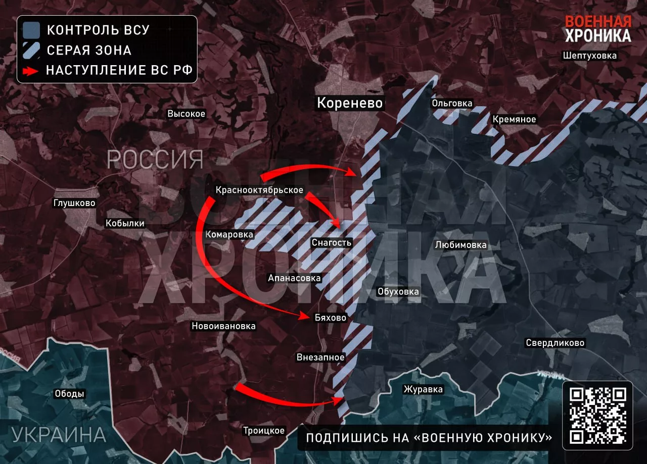 Если взглянуть на начертания фронта в Курской области, то напрашивается резонный вопрос: а не время ли для отсекающего удара через Сумскую область с последующим замыканием ВСУ там, куда они так упорно лезли на протяжение месяца?