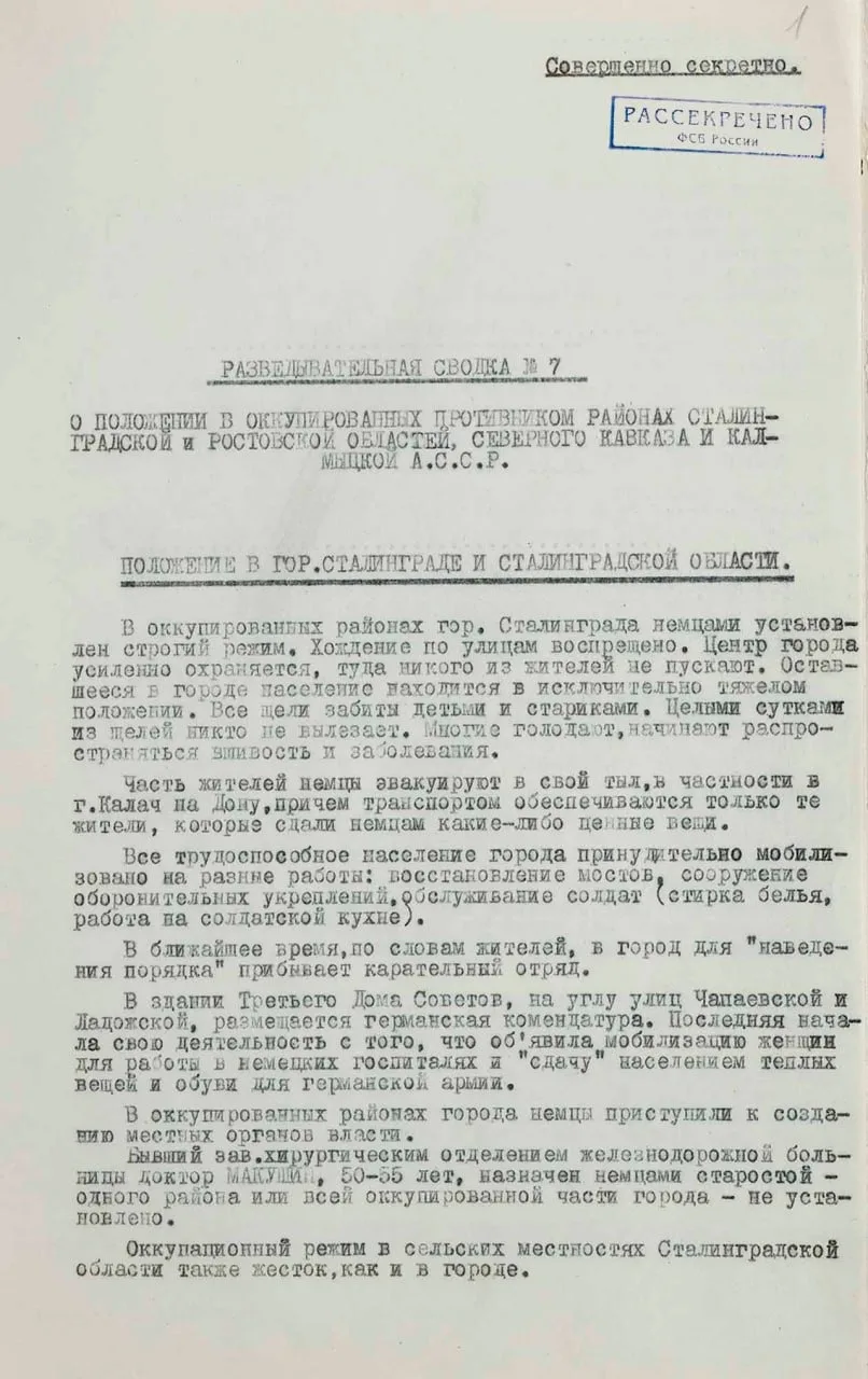 «Среди немецких и итальянских солдат на Сталинградском фронте отмечаются антивоенные настроения и дезертирство. Немец-дезертир в беседе с источником говорил: «воевать я все равно не буду, мои два брата убиты, сестра погибла при бомбардировке, мать пишет, что я бы сохранил свою жизнь. Я два раза пытался бежать к русским, но боясь, что меня могут убить свои, возвращался. Наши солдаты воевать не хотят, многие из них по 5-6 лет не были дома»», — говорится в докладе.