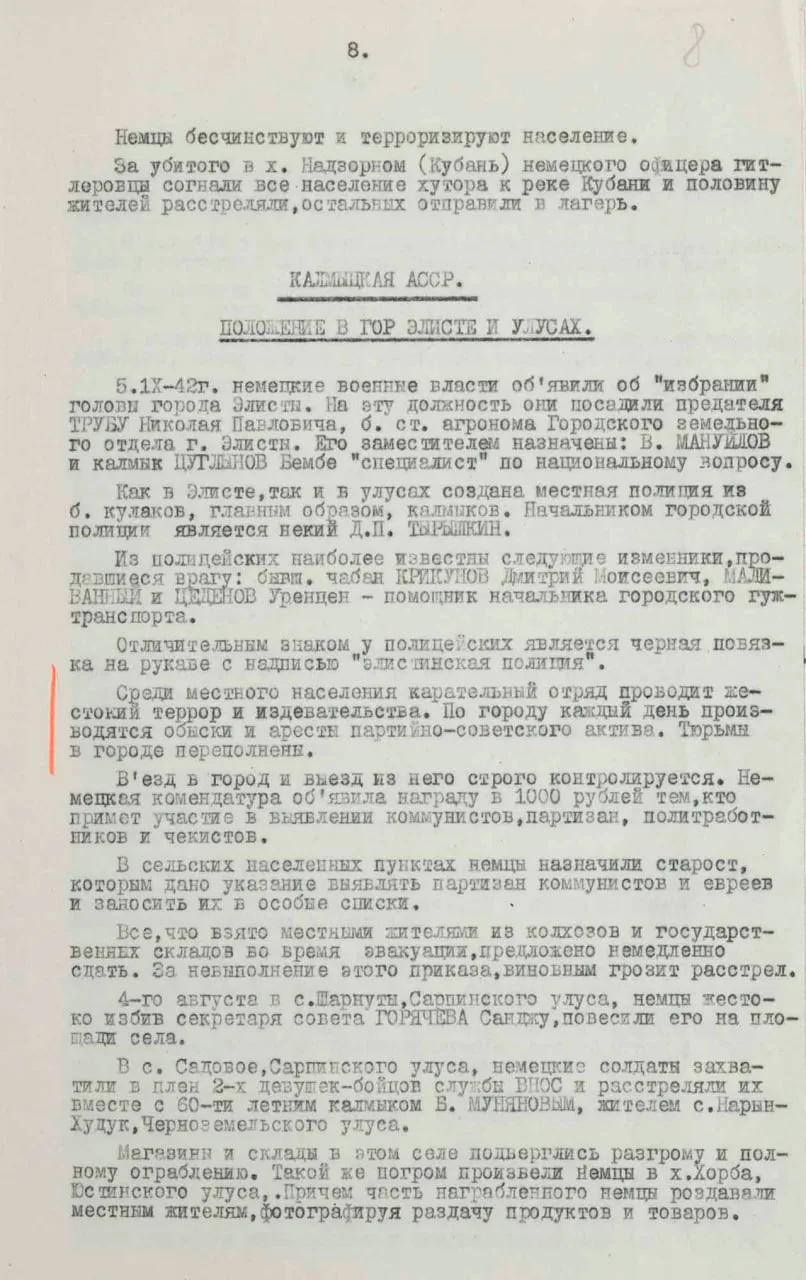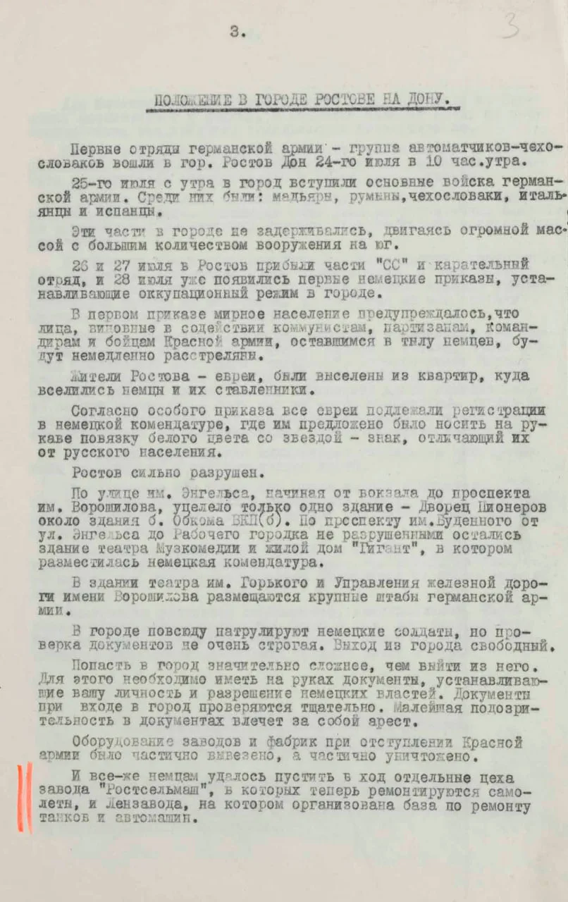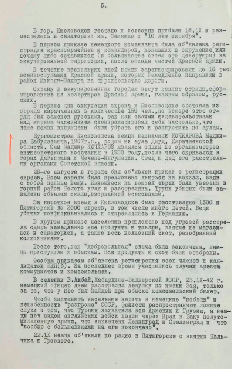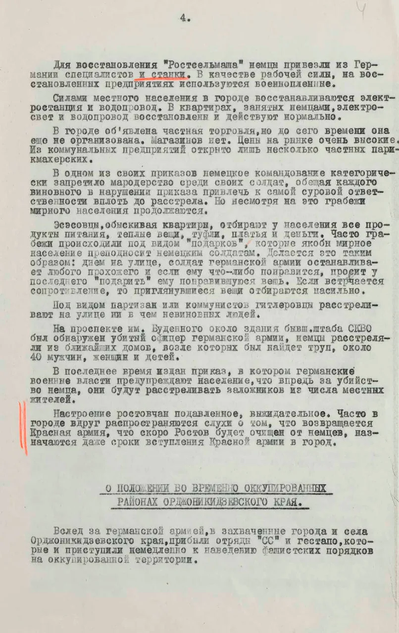 Также в документе опубликованы сведения о терроре и мародерстве немцев на оккупированных территориях. В Кисловодске расстреляли полторы тысячи, а в Пятигорске — до трех тысяч евреев. Очевидцы рассказывали, как эсэсовцы отбирали у мирного населения еду, одежду и деньги. Грабежи происходили под видом «подарков», которые жители, якобы, преподносили немцам.