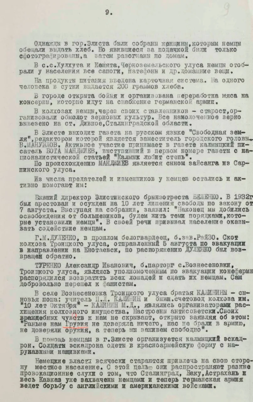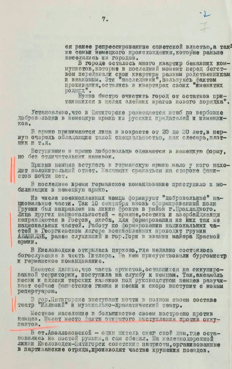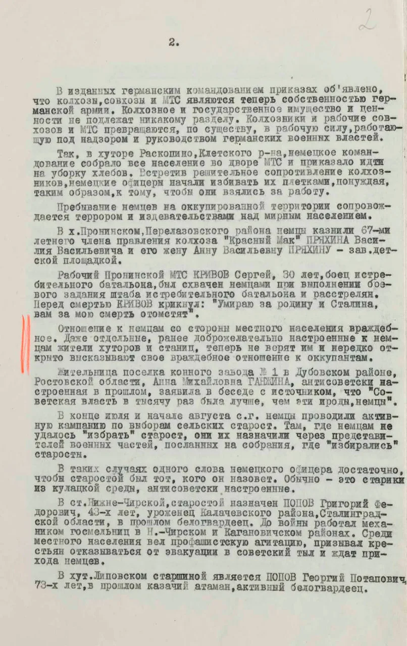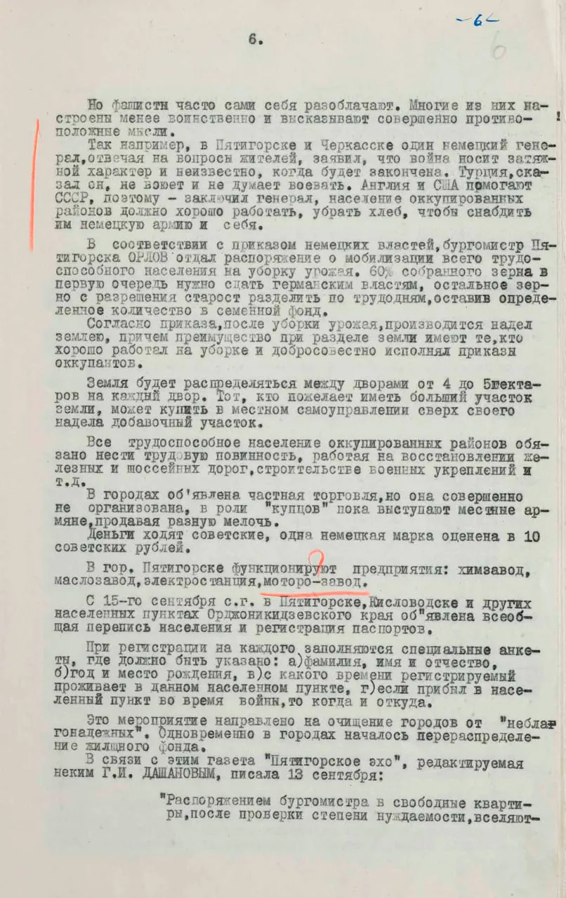 Также в документе опубликованы сведения о терроре и мародерстве немцев на оккупированных территориях. В Кисловодске расстреляли полторы тысячи, а в Пятигорске — до трех тысяч евреев. Очевидцы рассказывали, как эсэсовцы отбирали у мирного населения еду, одежду и деньги. Грабежи происходили под видом «подарков», которые жители, якобы, преподносили немцам.