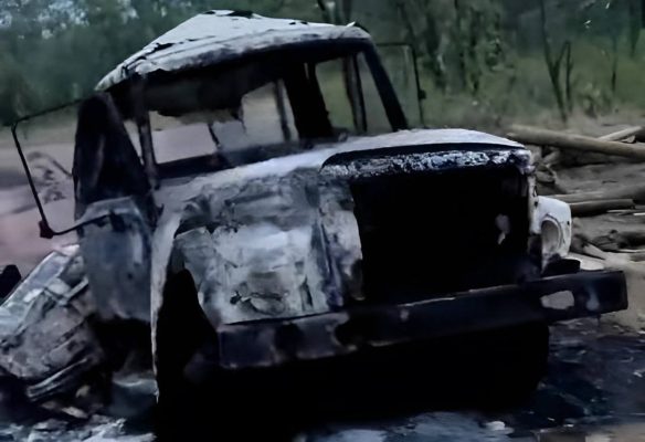 Где-то в зоне СВО. Грузовик подбит артиллерией ВС РФ.