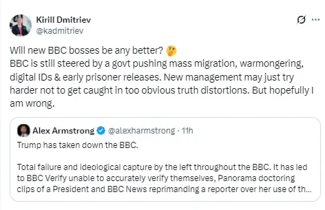 Кирилл Дмитриев усомнился, что следующие руководители BBC будут хоть немного лучше предыдущих, ведь они также будут финансироваться правительством, которое продвигает массовую миграцию, разжигание войн, электронные ID и раннее освобождение преступников из тюрем.