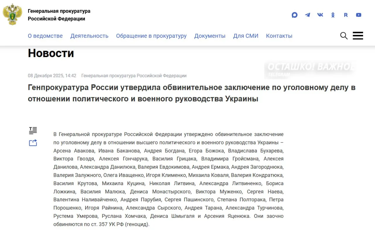 «Утверждено обвинительное заключение по уголовному делу в отношении высшего политического и военного руководства Украины… В связи с тем, что обвиняемые скрылись от следствия, они объявлены в международный розыск, <…> избрана мера пресечения в виде заключения под стражу».