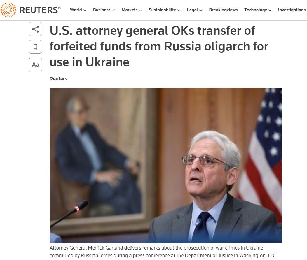 📝 «Хотя это первая передача Соединенными Штатами конфискованных российских средств на восстановление Украины, она не будет последней», – заявил генпрокурор Меррик Гарленд.