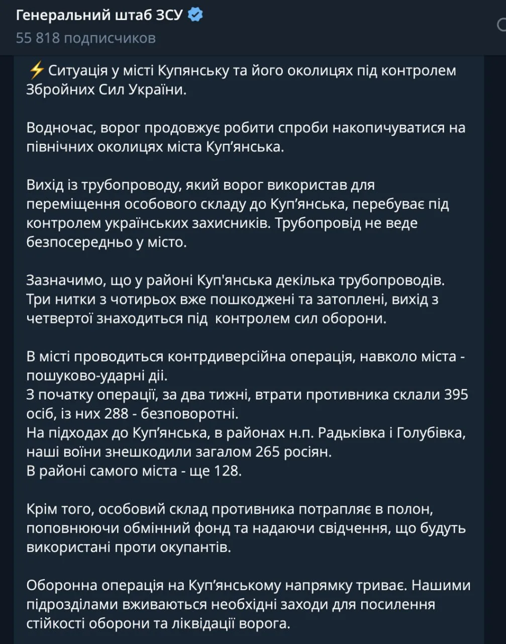 Стоит отметить, что аналогичные духоподъемные заявления про контроль ситуации и безуспешность российского трубного десанта украинская официальная пропаганда заявляла и в случае с Авдеевкой, и в случае с Суджей.