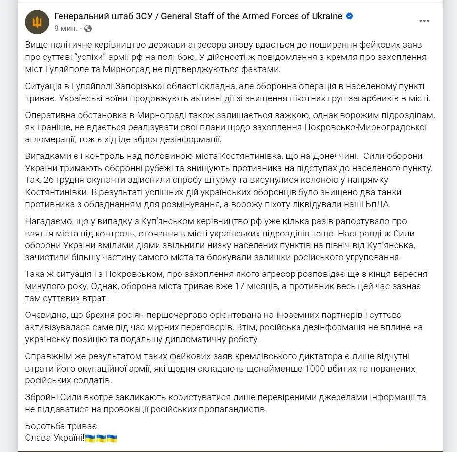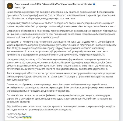 Более того, Генштаб ВСУ продолжает утверждать, что подразделения украинской армии удерживают Покровск. Командующий Нацгвардией Александр Пивненко заявил, что Украина накапливает силы под Покровском, чтобы пойти в контратаку. По его словам, ситуация в районе Покровска остается тяжелой, действия осложняют погодные условия.